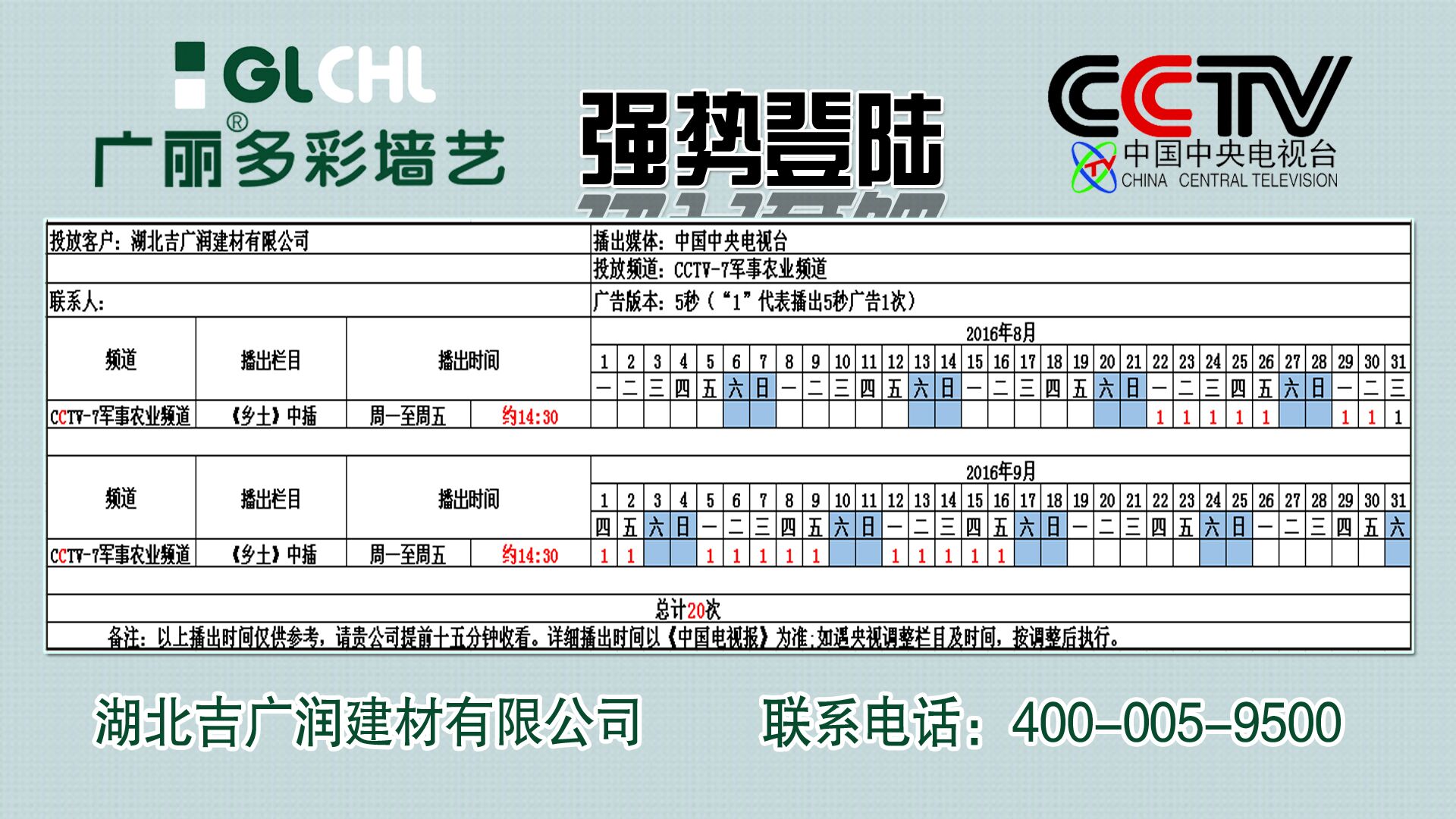 為了進一步提升廣麗多彩墻藝品牌形象,迅速拓展市場,經過二個月申請及審批,廣麗多彩墻藝品牌展播廣告將于2016年8月22日正式于中國中央電視臺7臺,開始為期兩個月的播出,具體播出時間將以央視最終播出時間為準,也請代理商經銷商通過當地自有途徑對展播信息進行宣傳、促銷等活動!